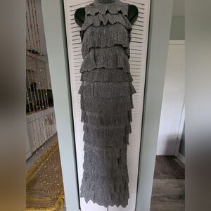 NWT Fashion Nova Tiered Ruffle Dress Silver Maxi Small Shimmer Bling Formal