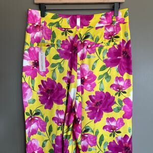 New with Tags Favorite Daughter The Fiona Floral Satin Wide-Leg Pants in Bold Camellia, Size 10, Yellow with Pink Purple Green Floral Print, High Waist, High Waisted, High Rise, Straight Leg, Wide Leg