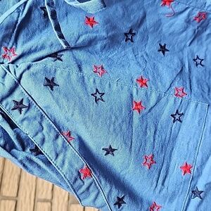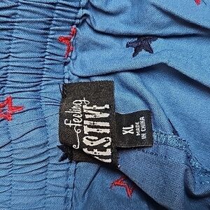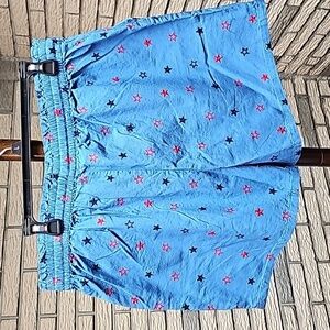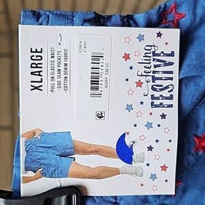 these shorts are new with tags sz xl side pockets med blue with red and navy stars tie to tighten waist if needed measurements in photos Smoke-free home