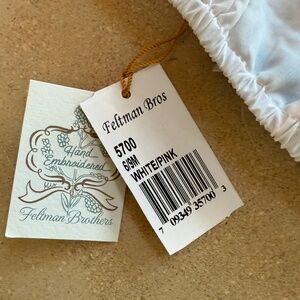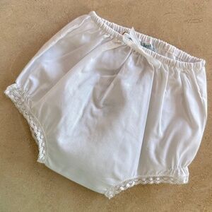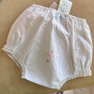 New With Tags! Classic diaper cover with French lace trim detail and dainty embroidered bow and flower. For a precious baby girl. Still full price on their website. Poly/cotton blend.