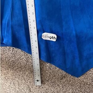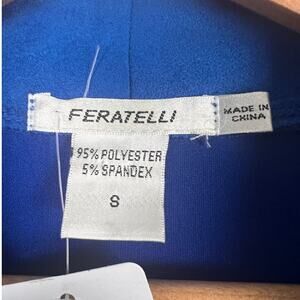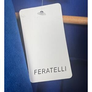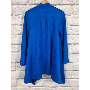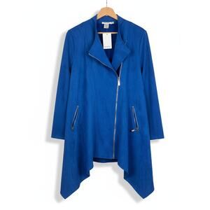 Combine edgy moto style with a soft, feminine drape in this stunning jacket from Feratelli, new with tags. This piece is crafted from a luxurious faux suede fabric in a vibrant cobalt blue, offering a rich texture and comfortable stretch. The asymmetrical zipper and dramatic draped, waterfall hemline create a unique, artistic silhouette that's perfect for making a statement.