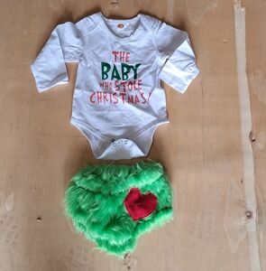 THE BABY WHO STOLE CHRISTMAS! Celebrate the holidays with this adorable baby bodysuit and shorts set. Featuring a playful Christmas design in white, green, and red, it's perfect for festive occasions. Soft and comfortable for your little one.