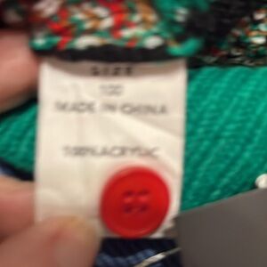Colorful sweater featuring a gingerbread design. Bright green accents and festive patterns.
