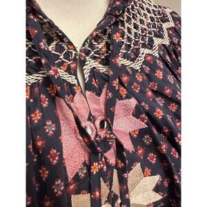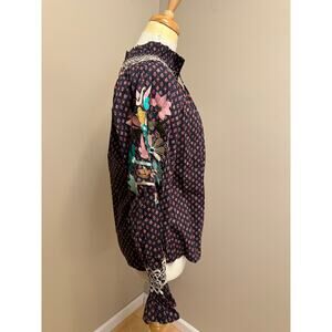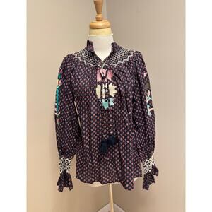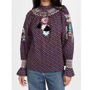 Fabric: Lightweight, non-stretch weave • Ruffle neckline with hook-and-eye placket • Tassel ties at front • Smocked elastic yoke and cuffs • Long puff sleeves • Floral embroidery with sequin mirror accents • Shell: 100% cotton • Dry clean • Imported, India