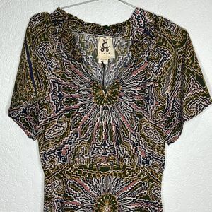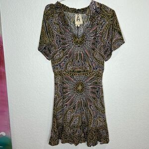 NWT Figue Cleo Silk Ruffle Neck Belted Dress in Medallion Multi Spruce XS