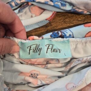 New with tags size Large Filly Flair Dress in a pretty floral print in shades of blue, red coral, pink, and white on a light sky blue background. Criss cross open back. Buttery soft and super stretchy fabric. Comes from smoke free and pet free home.