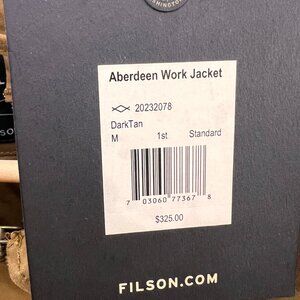 Brand New Filson Aberdeen Work Jacket Tan Color. Size Medium. Made in Vietnam. The Aberdeen jacket’s design is from Filson’s archives. Waxed cloth protects against the elements. It accepts Filson liners. Ideal for work or casual attire. Lifetime Warranty from Filson. There are also lots of online video reviews for this handsome jacket.