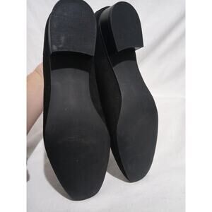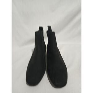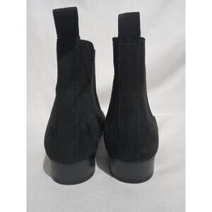 Lovely pair of brand new ankle boots from find in size 10. Per the tag the upper is polyester while the lining and sock are polyurethane polyester while the outer sole is rubber. The exterior is a solid dark black in color and has a suede feel to it. The block heels are 1 in high. Both sides of the boot feature a 2-in by about 4 in section of elastic to assist with fit. Please note although these boots are new with tags it looks like there are a mark or two on the bottom perhaps from shelfware. They also seem to have been stored by something that shed glitter.