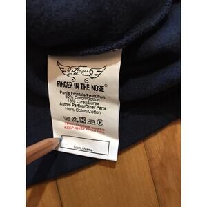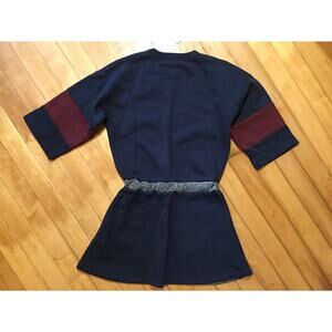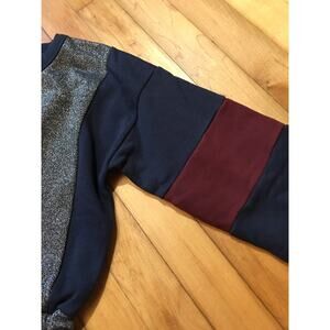 Size large, 5/7. Navy with maroon and silvery panels. Cinched waistline. Sweatshirt material. Cotton blend. French brand Finger In The Nose.