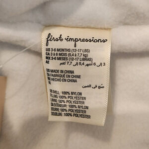 First Impressions Baby Boy Hooded Jacket, size 6-9 Months. This cozy jacket is fleece lined inside, perfect for keeping your baby snuggled and warm. New with tags, never been worn! Retail $42.