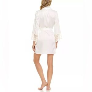 Step into luxury when you don this matte charmeuse wrap robe from Flora by Flora Nikrooz finished with sweet heart lace trim at the sleeves.