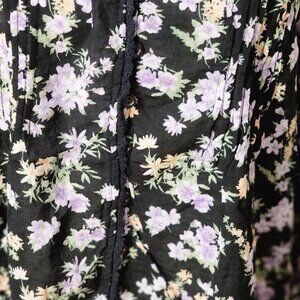 New with tag. Lovely Floral print, lightweight blouse. Pleated detailing vertically along bust line. Functional buttons allow you to open the shirt for a different look or tie a knot at the hem. Paired with high-waisted, flared jeans?! YESSSSS! Featured colors: black, peach, lilac, green, white