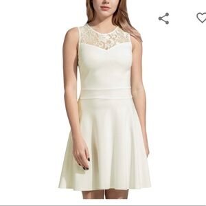 short A-line shaped evening or cocktail dress with round neck. it is casual yet suitable for any special occasion, from wedding ceremony to prom. Hidden zipper at the back. Top back and front made with resistant nice see-through floral lace. This elegant dress hits right above the knee. The soft, high quality stretchy fabric makes you look great and makes this dress close fitting, very comfortable and super flattering. Standard US sizes. For detailed information, please refer to size chart. New with tag only flaw is very small discolor see 4th photo