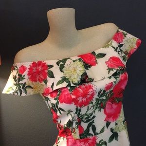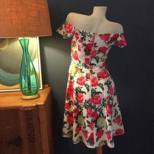 Pretty off shoulder floral print dress. Side pockets. Attached under-slip. Please note there is no stretch to the fabric. Dry Clean. S=32" bust, 27" waist, 34" hips. M=34" bust, 29" waist, 36" hips. L=36" bust, 31" waist, 38" hips. 35" length.