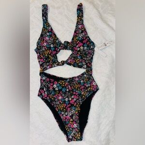 Celebrity Pink, Stylish one-piece with vibrant floral pattern. Features a unique front knot design. Perfect for a chic beach look, rave, or festival!