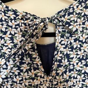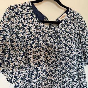 NWT Listicle short sleeve tiered mini dress in size large. Navy with white and yellow floral print. Pockets. Tie back. Fully lined. Elastic arm bands. Soft material.