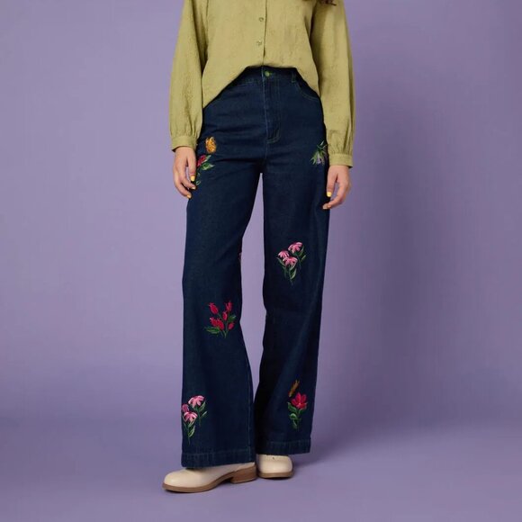 Princess Highway Garden Party Embellished Jean in gorgeous dark denim! These eye-catching jeans feature beautiful garden floral and sweet butterfly embroidery throughout, creating the perfect whimsical touch to any outfit. The green contrast button and stitching add a playful pop of color while the high-waisted fit and full-length straight cut leg create a flattering silhouette. Made from 100% cotton denim with rounded front pockets and back patch pockets for both style and functionality. From a smoke, pet and fragrance free home.