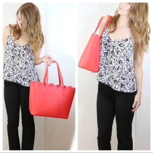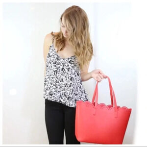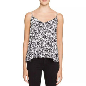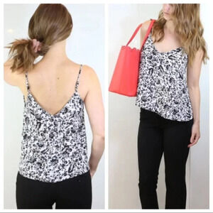 Classic black and white abstractly yet delicately bring pop to this free flowing adjustable strap top.