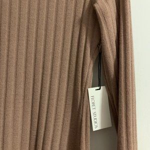 NWT Floret Studios Twist Back Long Sleeve Ribbed Mock-Neck Sweater Dress in Mocha, Size Medium.