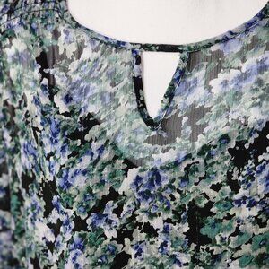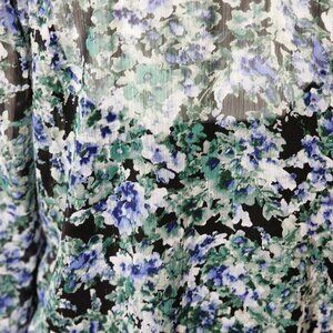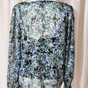 New with tag! Lovely semi-sheer shirt. Comes with camisole layered underneath. Flower pattern. Featured colors: black, blue, green, white, with some metallic silver threading throughout.