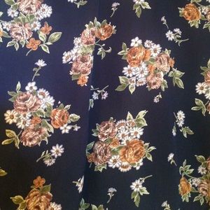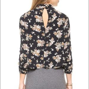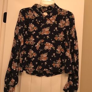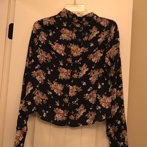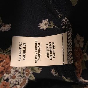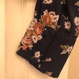 NWT Flynn Skye Kitty Blouse, navy background with floral print, long-sleeved, collared with buttons at back of neck, buttons on cuffs