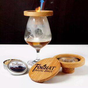 Smoke up a handcrafted cocktail with the Foghat Cocktail Smoker set. Change the way you experience food and spirits with the smoker; hand-turned from a solid piece of white oak, which sits easily on a rocks glass, snifter or cloche. The included flavored natural smoking fuel creates a cascading waterfall of culinary smoke, which enhances the flavor of your food and spirits. Please note that butane is required for use but is sold separately.