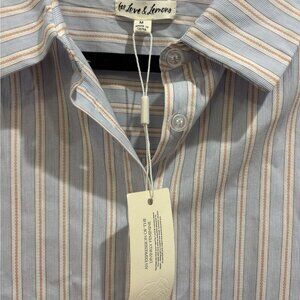 NWT Lakeside Stripe Button Down Top in a soft blue and tan palette. Relaxed, slightly oversized fit with a classic collar, long sleeves, and crisp cotton feel. Easy, effortless piece that works tucked into denim or styled open with a tank for a breezy everyday look. Fresh, clean, and never worn.