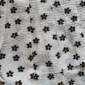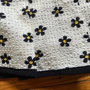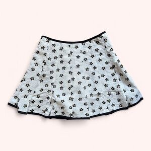 This mini skirt has an all over daisy print, a pleated design, a contrast colored satin trim, and a back zip closure.