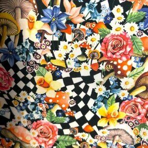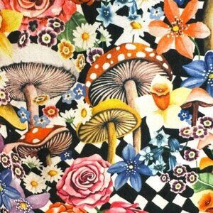 Checkerboard background print with colorful flowers and mushrooms throughout