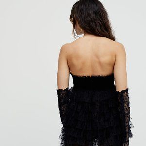 Self: 100% poly.Contrast Fabric: 58% poly, 32% recycled poly, 10% spandex.Lining: 96% recycled poly, 4% spandex. Made in China. Dry clean recommended. Attached bodysuit lining with gusset snap button closure. Hidden back zipper closure. Ruched velvet bust with V-wire sweetheart neckline and boned sides. Includes sheer lace gloves with hidden zipper closure.Ruffled tulle fabric with velvet flocked polka dot detail. Neckline to hem measures approx 23" in length. Revolve Style No. FORL-WD950. Manufacturer Style No. CD2559-HO21.