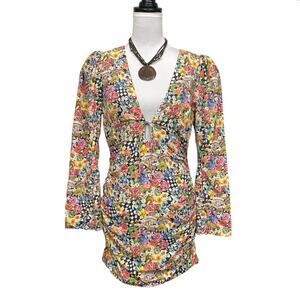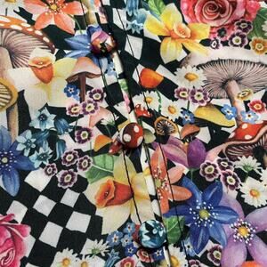 Floral, bell sleeve, multicolor mini dress features a plunging v-neckline and a flattering fit-and-flare silhouette, perfect for warm-weather, fall outings or special occasions. With its charming pattern of flowers, mushrooms, checks it offers both style and a playful attitude. Pair it with strappy sandals, heels or the perfect cowgirl boots! Side hidden zipper, fabric covered buttons, unlined.