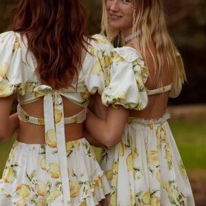 ~Destined to be your main squeeze, this flirty dress features a fresh lemon print, short puff sleeves, and an open back with a scrunchy elastic strap.