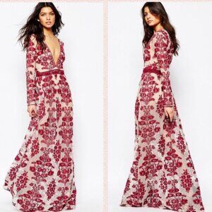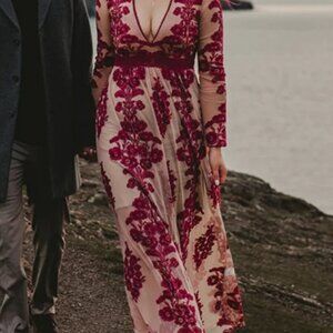 This standout maxi celebrates bohemian elegance with its dramatic sheer mesh base and intricate all-over floral embroidery in rich red tones. Designed with a deep, plunging V-neckline and accentuated by a crochet-trimmed waistband, the dress beautifully defines the figure. The bodice fits snugly, while the skirt flares into a full, flowing silhouette—lined with a nude bodysuit for modesty and comfort. Long, sheer sleeves balance the look, and a hidden back-zip closure ensures a seamless finish