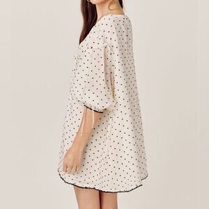 Tent dress featuring tiny velvet flocked hearts. Drawstring neckline for adjustable coverage. Puff sleeves. Shoulder ruffles. Contrast black picot edge stitching throughout