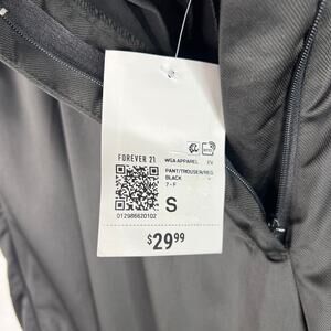 New with tags Forever 21 black satin-y material wide leg pants with pleated front and pockets. Zip and hook closure with slightly elasticized waist. Size small.