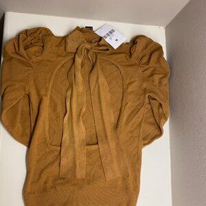 New, with tag, Forever 21 Cropped Sweater with back cutout (size Junior's Medium). The color is a true mustard. Beautiful puffed, ruffled shoulders and sleeves. Exposed back with bow detail. Runs very small and very short. This is juniors' sizing, not women's sizing. Super cute!