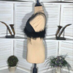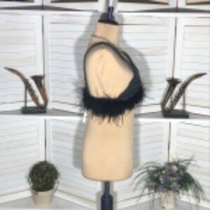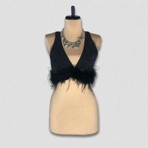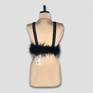 NWT Forever 21 Denim Bralette Top Ostrich Feather-Trim Square Open Back Black S