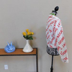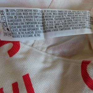 Material is 100% cotton denim in a lustrous summer white w/ apple red screen print lettering. Gender bend & say that.