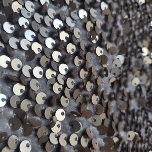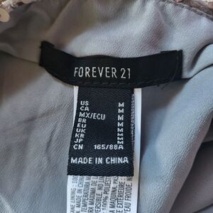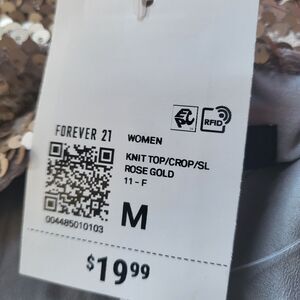 This is a brand new Forever 21 crop top tank made of a polyester blend material. It has a square neckline and strappy sleeves. The top is adorned with rose gold sequins, giving it a shiny and sparkly look. It is a size small and has a solid pattern. The top is perfect for a night out or a special occasion.