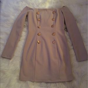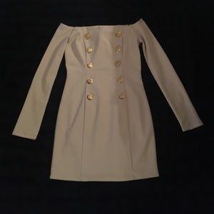 Beautiful tan dress with gold (eagle) buttons, long sleeves, 96% polyester 4% spandex. Brand new, never worn, with original tags