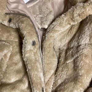 Soft tan colored faux fur. Zipper & snap closure. Adjustable bungee bottom. With matching fur face mask.