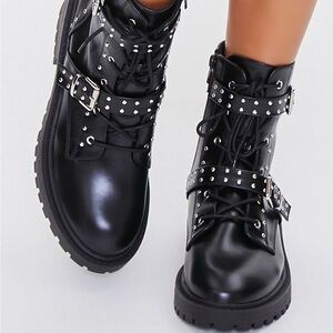 New With Tags, brand new condition, Forever 21 black studded strap combat boots in size 7.5! Fit size 7 as well. Very cute to add an edge to your outfit for fall and winter!