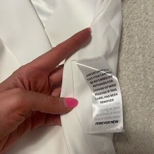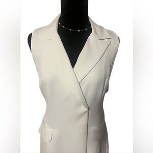 This white blazer dress from Forever New offers a modern twist on classic tailoring with its sleeveless design and structured silhouette. Crafted from a formal suiting fabric, it provides a sophisticated look suitable for both professional and dressy casual occasions. Fully lined.