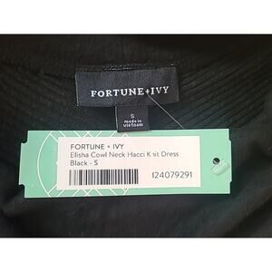 Elevate your wardrobe with this stunning Fortune + Ivy sweater dress. The dress features a flattering cowl neckline and a pullover closure, making it easy to slip on and off. The long sleeve and knit fabric make it perfect for any season, while the lightweight feel ensures ultimate comfort. This dress is versatile enough to wear to a party or cocktail event, work, or for casual outings. The solid black color and city-classic theme make it a wardrobe staple. Care for the garment is simple with hand washing, and the asymmetrical feature adds a unique touch. Don't miss out on the opportunity to add this beautiful dress to your collection.