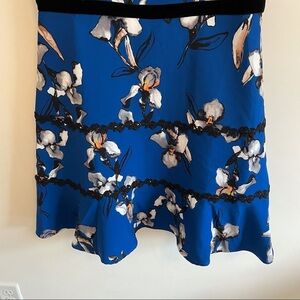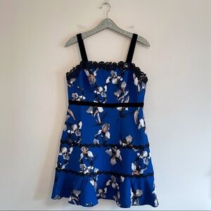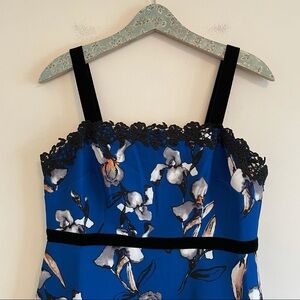 Features: blue and black floral print, lace trim, velvet straps, mini length, fit & flare.