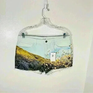 Description: Zip and button fly; five pocket construction; raw hem; high rise. Stunning printed denim shorts with wildflower pastoral scene. (These shorts run larger than size).