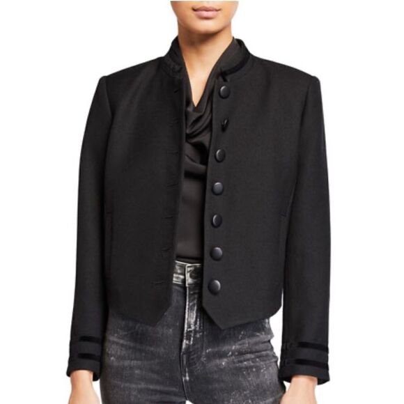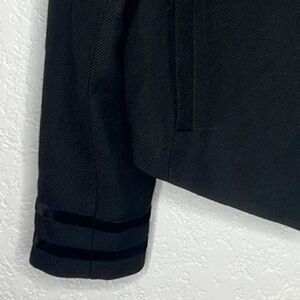 Features button cuffs, button front closure, lined. Standup collar. Velvet trim.