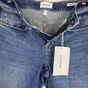 NWT Frame L’Homme Cut Off Denim Shoredale Rips Mid-Rise Straight Leg Blue Jean Shorts 30 NEW. In new with tags condition. Button and zipper work well as shown in photo. When laid flat, these measure 16” across the waist, they have a rise of 9.5” and an inseam of 11”.