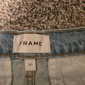 Frame Le Bardot Exposed Button denim shorts. These are in the Trevi wash which is light blue. They are brand new with tags and a size 30. They measure as follows: waist-33 inches, hips-38 inches, rise-12 inches, and inseam-3 inches.