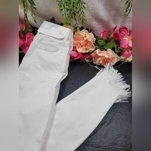 Straight Skinny leg. Frayed bottom hems. White in color.